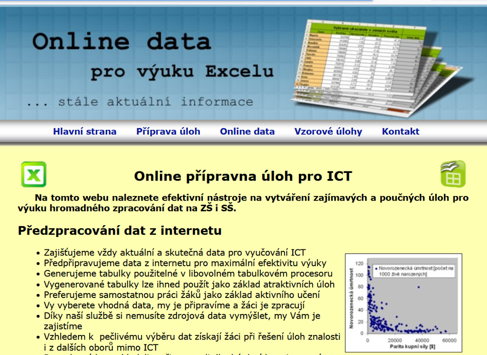 Tato pomůcka učitele v podobě webové aplikace automatizuje získávání aktuálních dat tak, aby je učitel mohl okamžitě použít ve výuce hromadného zpracování dat. Umožňuje snadno získat rozsáhlé a přitom přehledné tabulky s aktuálními údaji. K dispozici jsou údaje o aktuálním počasí v ČR nebo v Evropě, vývoji kurzů světových měn vůči české koruně, ceně vybraných komodit (zlato, stříbro, platina, ropa, zemní plyn, elektřina) na mezinárodních trzích, sportovních výsledcích (fotbalová Chance liga, hokejová Tipsport extraliga, basketbalová NBL) a 30 charakteristikách států světa. Učitel si zvolí typ dat, která chce získat, a nechá si vygenerovat náhled. Pokud je spokojen, potvrdí stažení dat do jednoho z nabízených souborových formátů (XLSX, ODS, CSV). Výsledný soubor pak stačí nasdílet žákům, kteří si jej otevřou v tabulkovém editoru (MS Excel, LibreOffice Calc, …).